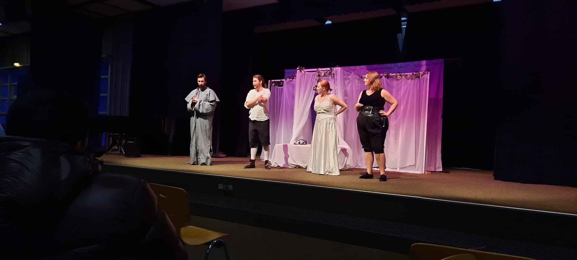 Die Stücke wurden von vier jungen englischsprachigen native speakern mit dem Einsatz ihrer Stimme, Mimik und Gestik schauspielerisch professionell umgesetzt, so dass die Schüler*innen den Stücken dauerhaft und gespannt folgen konnten. Einige Schüler*innen der Unterstufe durften sogar auf die Bühne und beherzt mitspielen, was allen viel Freude bereitete und den Beteiligten großen Applaus einbrachte. Ein besonderer Gewinn für die Schüler*innen war das Gespräch auf Englisch nach der Aufführung. Das Ensemble stellte sich den Fragen der Schüler*innen aller Art, so z.B. wo sie herkämen, warum sie diesen Beruf gewählt hätten, und was sie an Deutschland mögen würden, wobei bei letzter Frage das gute Essen von den Schauspieler*innen lobend hervorgehoben wurde.