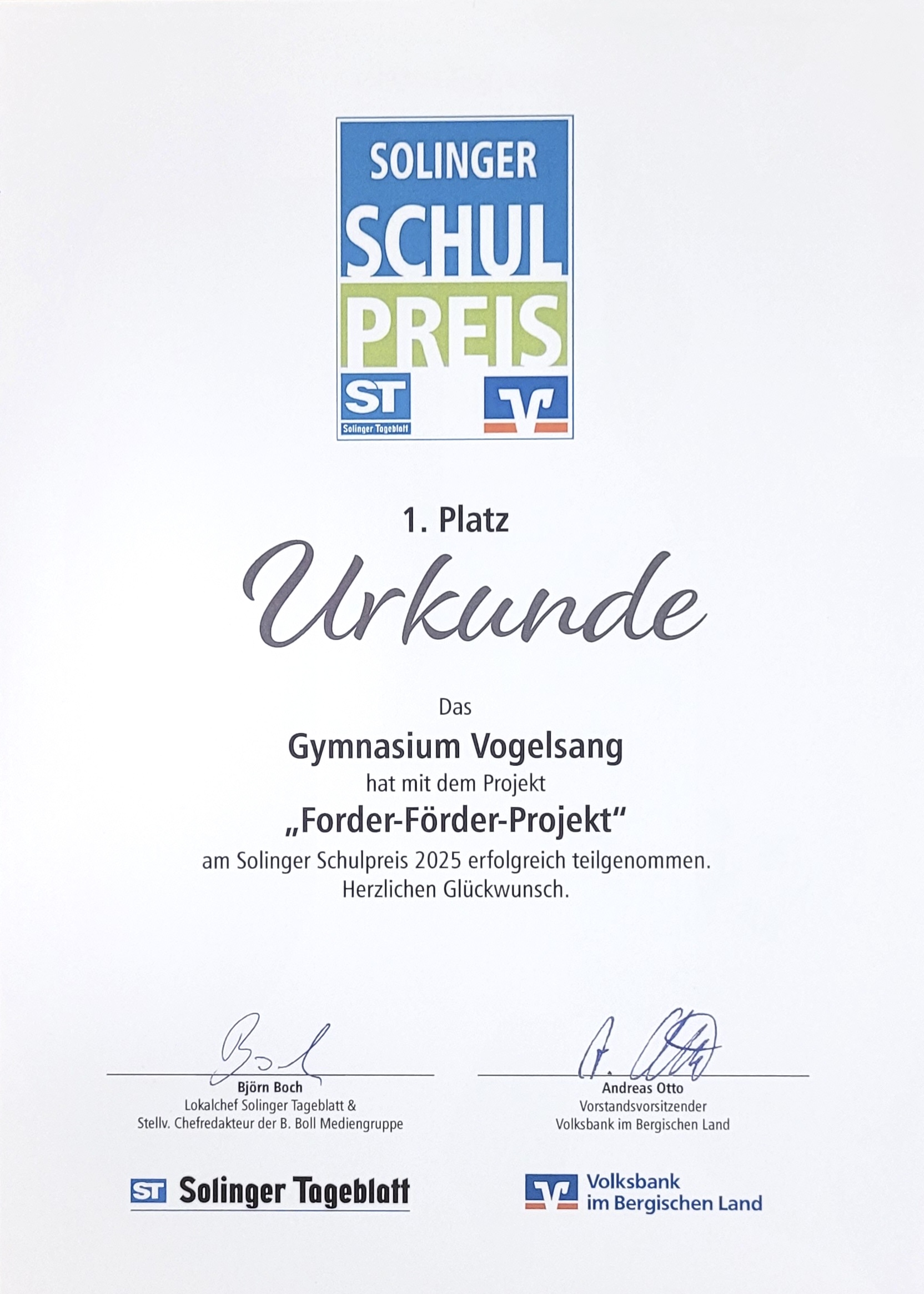 "Große Freude bei uns am Gymnasium Vogelsang: Unser Forder-Förder-Projekt wurde mit dem 1. Platz beim diesjährigen Solinger Schulpreis ausgezeichnet – und mit 2000 € Preisgeld belohnt!
