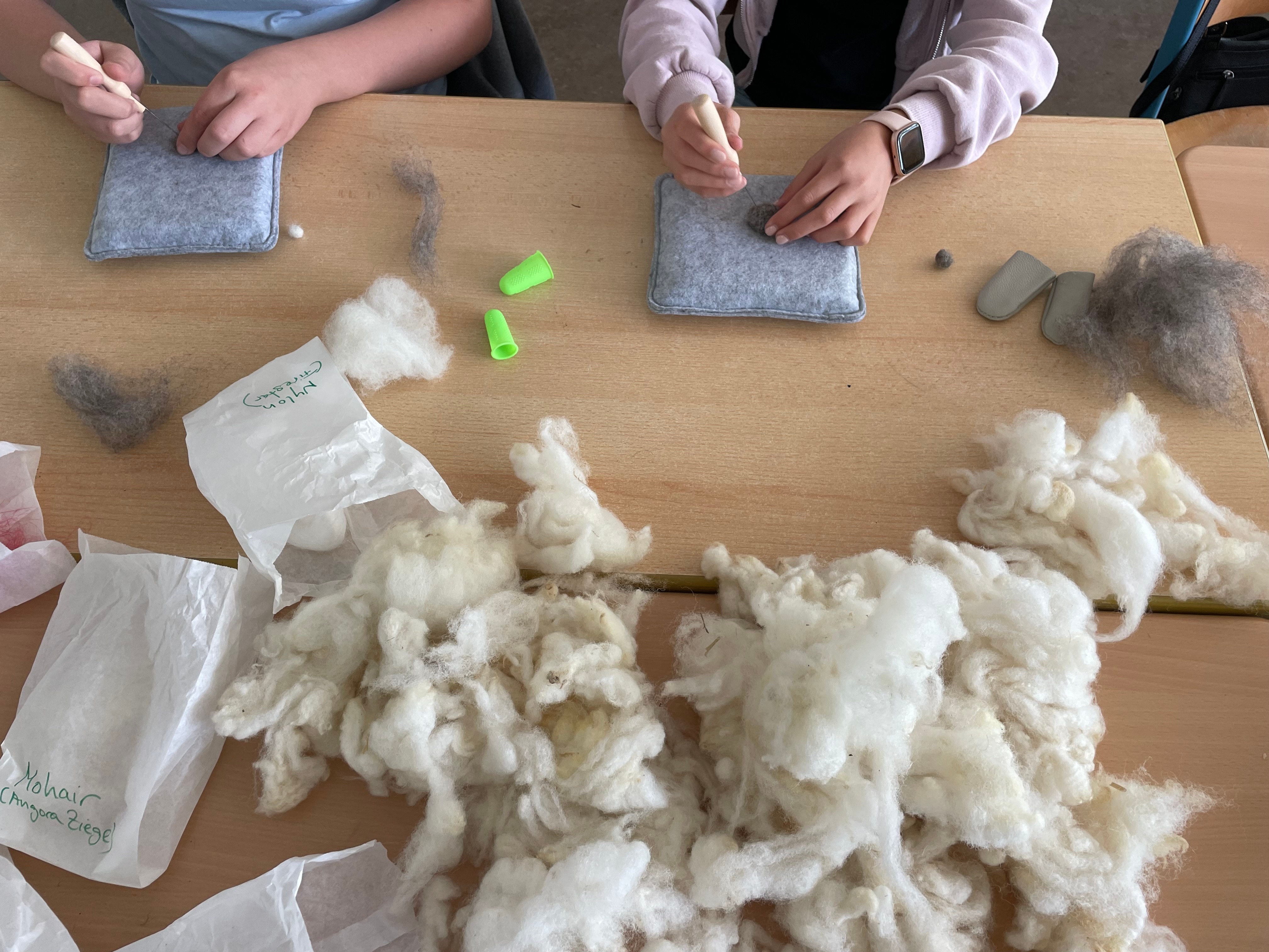 In der Filzwerkstatt erarbeiten die Schüler zusammen mit den Lehrern individuelle Gegenstände, wie zum Beispiel Schlüsselanhänger oder Tiere. Dazu müssen sie die Schafwolle zunächst kardieren und spinnen, bevor sie weiterverarbeitet werden kann.